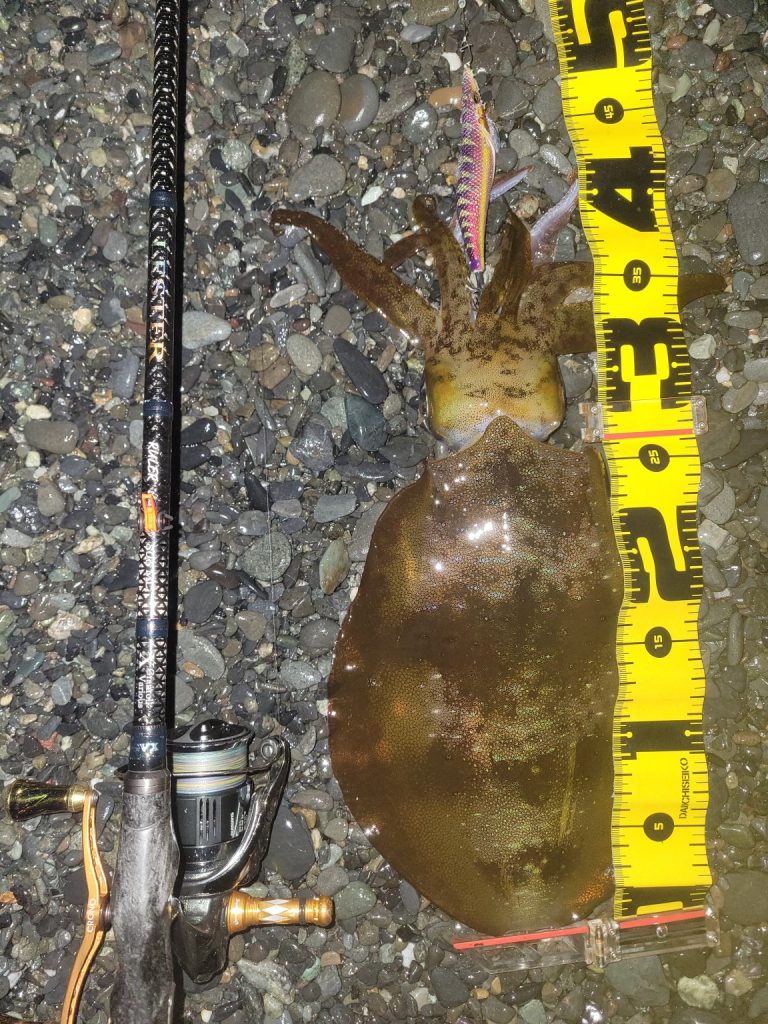 とりあえずタイミングは良いはずとキャスト、シャクリを繰り返すとフォール中エギが微妙に動いたと思ったので合わせるとヒットしました。