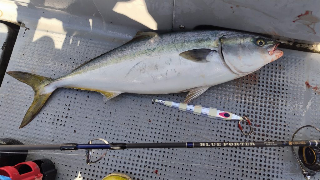 ブルーポーターJG/4を使用してティップ、ベリーを使い早巻きで追わせ、ロングジャークで食わせるとゆうパターンでメジロ捕獲♪